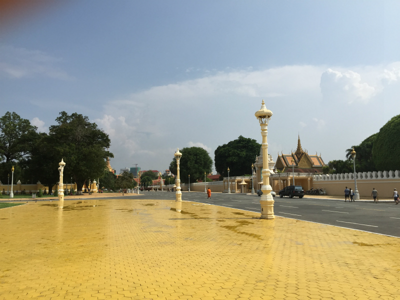 腹ごしらえを済ませて、王宮方面へ歩いた。黄色い屋根の王宮の前の歩道にも黄色のタイルが敷き詰められ、強い日差しが照り返して若干目が痛くなった。