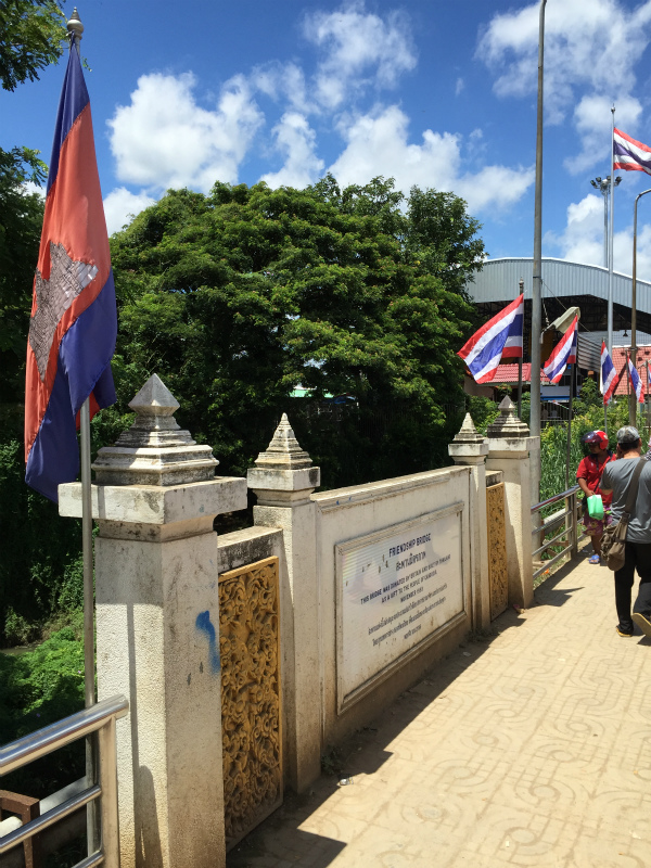 少し歩くとアンコール・ワットを象った門があり、その先の小川に長さ十数メートルくらいの「友好の橋」が架かっていた。この小さな川が、本当にカンボジアとタイとを隔てている地理的なもであるらしい。「友好の端」の碑の両端にはそれぞれの国旗が掲げられ、これでようやく国境を超えたという実感を得られた。