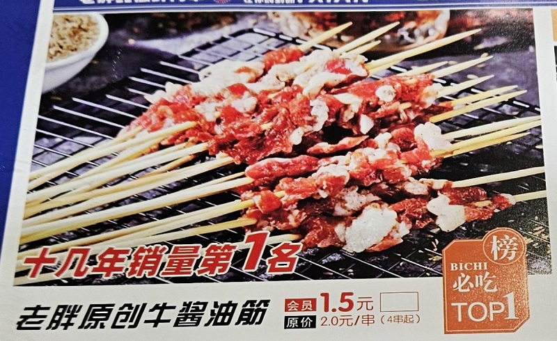 スキー場に向かう前に、吉林市出身の会社のスタッフから勧められた店で食事をしましたが、この牛串が日本人好みの醬油味で、とても美味でした。
