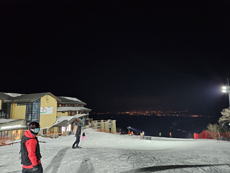 山頂へ登るゴンドラは夜も営業し、オレンジ色の吉林市街の夜景目掛けて滑り降りました。