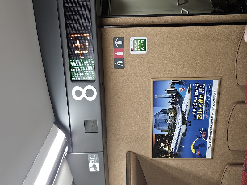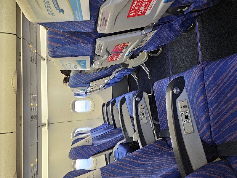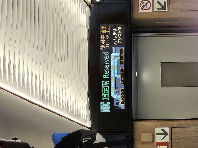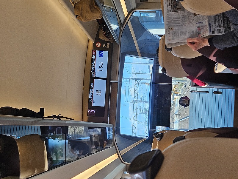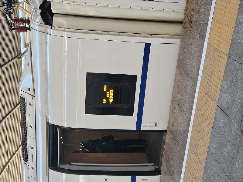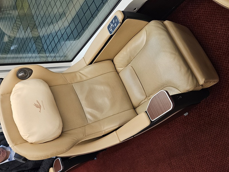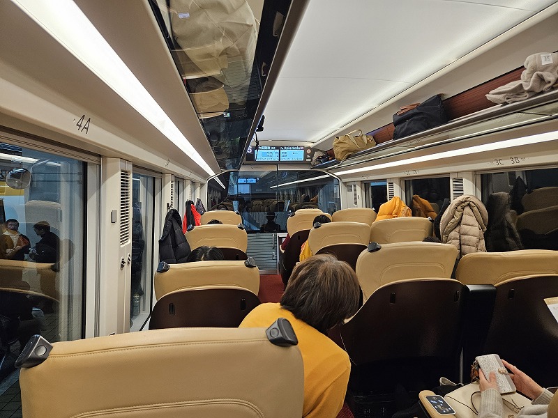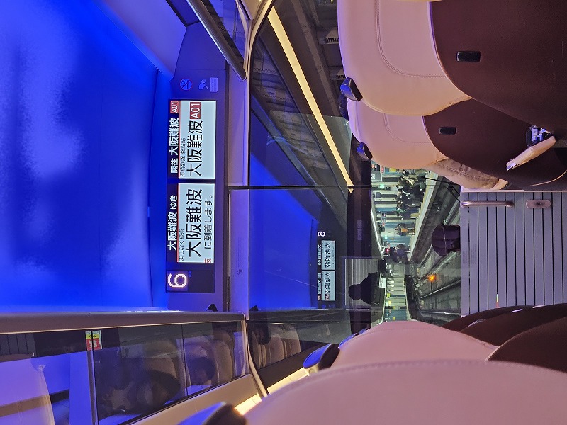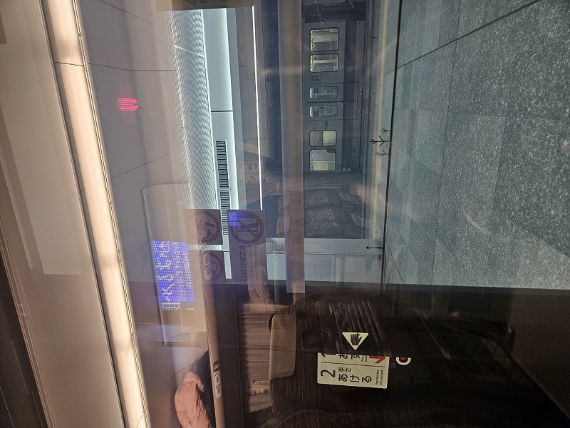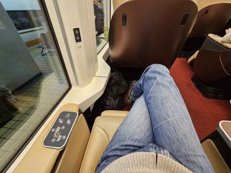 帰りの席は進行方向壁側の三列席真ん中で窮屈なのを覚悟していましたが、写真の通りガラスドアの目の前で開放感があり、足元も狭くなく、むしろ当たりだったと思います。