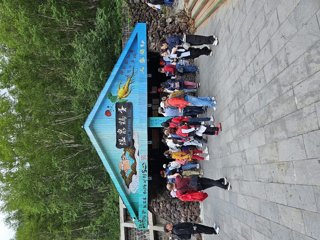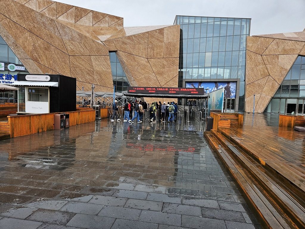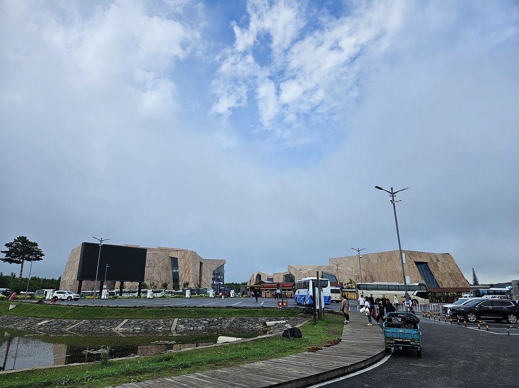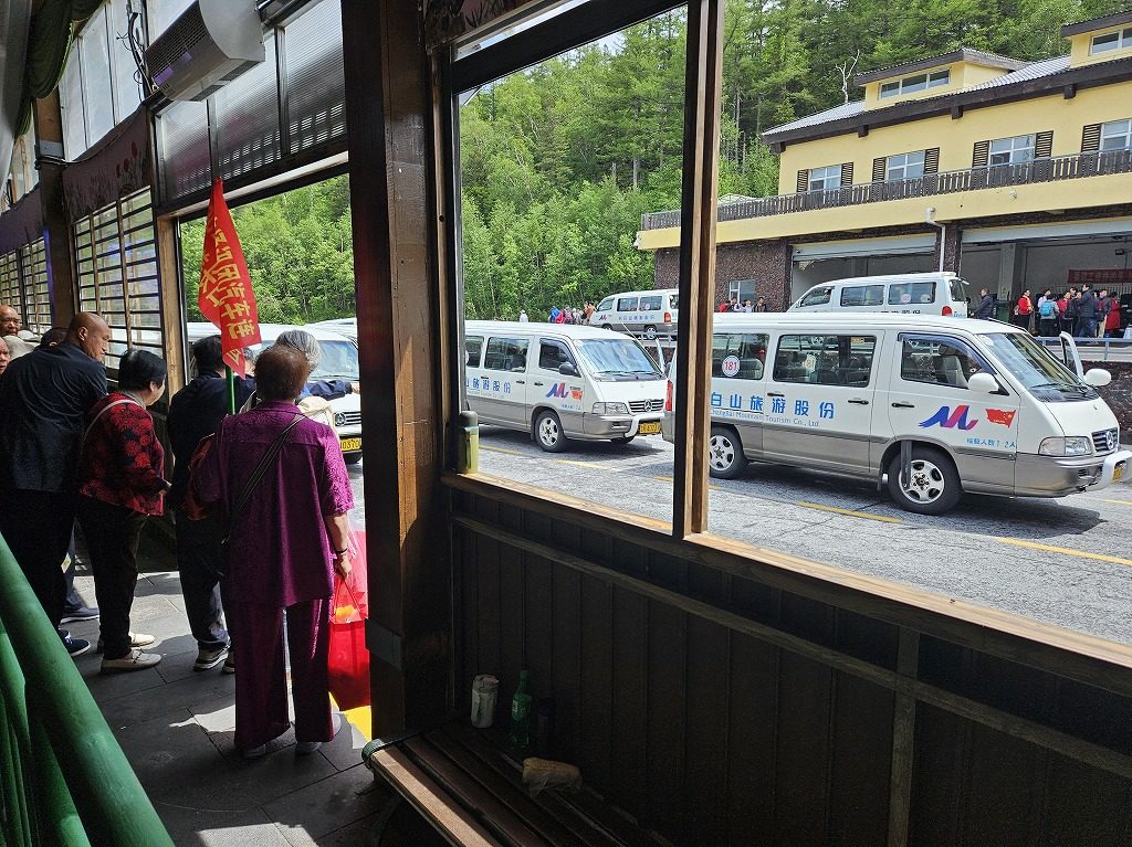 ゲートの上の電光掲示板には「天池(頂上)は霧が濃いので見えません」と表示されていましたが、 団体客が次から次へと私たちの目の前を通り過ぎていきました。